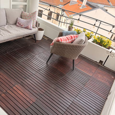 Terrassefliser i brun treimitasjon. Brukt i balkong. Flisene består av mindre bord satt sammen i mønster på plastunderlag, egnet for bruk på terrasse, balkong eller andre jevne utendørs underlag. Kan legges som flytende gulv og er enkle å tilpasse ved behov. Fargen er brun med noe patinert preg.