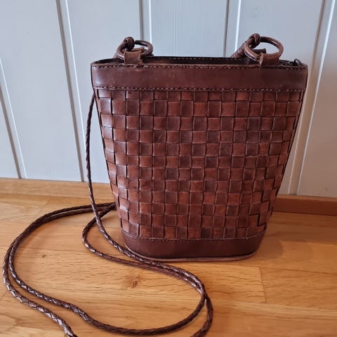& Other Stories skulderveske i lær for dame. Vesken er laget i brunt lær med flettet front og glidelåslukking øverst. Lang skulderrem med justeringsmulighet. Innvendig finnes et hovedrom og et lite kortrom i lær. Egnet til hverdagsbruk når man trenger plass til nødvendigheter som mobil, nøkler og småting.