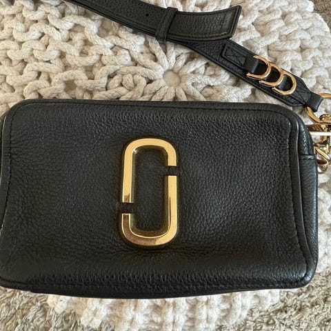 Marc Jacobs skulderveske i lær for dame. Vesken er i svart skinn med justerbar skulderrem og metall-detaljer i gullfarge. Den har to hovedrom med glidelåslukking og flere mindre innvendige lommer, inkludert kortholder.