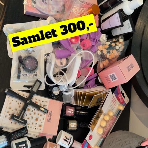 Neglesett til hjemmebruk med ulike verktøy og neglelakker. Inneholder blant annet negleklipper for kunstnegler, flere dotting tools og pensler, neglefil, elektrisk negleverktøy, negleformer, ulike fargede neglelakker og gelélakker samt tilbehør som lim og tips. Egnet til enkel negledesign og vedlikehold av negler hjemme.