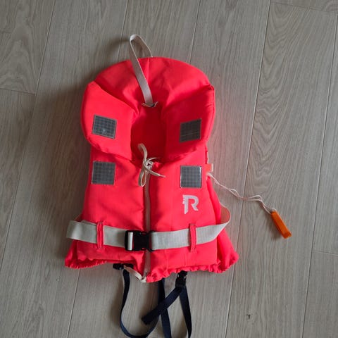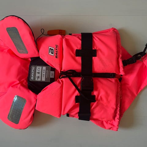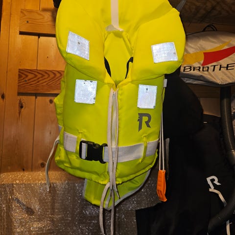 Selger en redningsvest som har ligget rørt i boden. Fremstår lite brukt. Har fått seg et par svarte dotter på ene siden ikke særlig synlig men sees på bildet. Produsert 2020. Usikker hvor lenge /krav for maks år bruk. Men sikkert fint å ha med vannet.