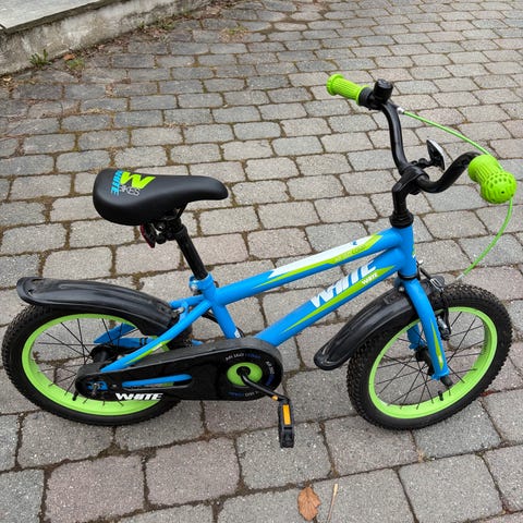 Roswell Racer barnesykkel med 16" hjul. Sykkelen har ramme i stål med blå, gule og oransje detaljer og hel kjedekasse med motiv. Utstyrt med skjermer foran og bak, ringeklokke og sete i matchende farger.