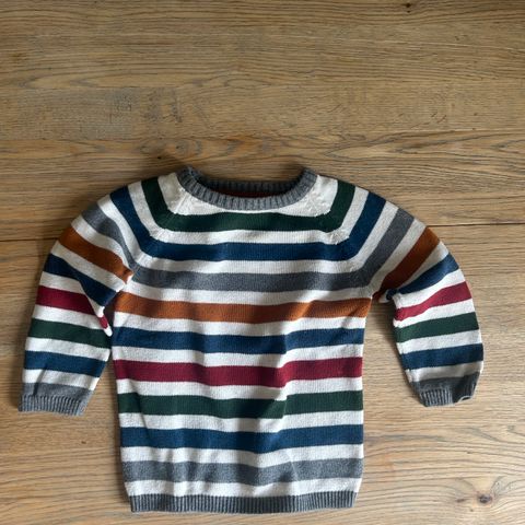 Zara genser for barn i størrelse 98. Unisex-modell i hvit bomull med horisontale striper og lange ermer. Rund hals med ribbekant. Passer til hverdagsbruk for barn rundt 2–3 år. Noen merker frempå, de er veldig lite synlig i dagslys. Se siste bilde
