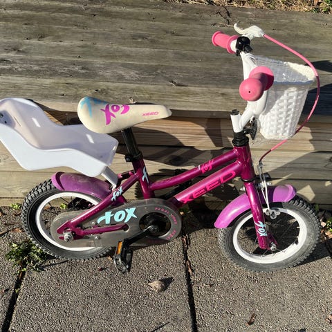 Denne sykkelen ble kjøpt på thansen for 3 år siden. Den har vært brukt to sesonger. Den har litt rust her og der, men er fortsatt i god stand. Det følger også med kurv, støttehjul og håndtak bak.