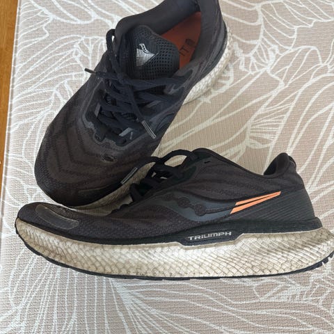 Saucony Omni 21 løpesko i størrelse 43. Modellen er egnet til løping og har overdel i pustende materiale med støtte rundt foten. Skoen har mellomsåle med demping og slitesterk yttersåle til bruk på asfalt og andre harde underlag. Fargekombinasjon hovedsakelig svart med lyse detaljer og lys mellomsåle.