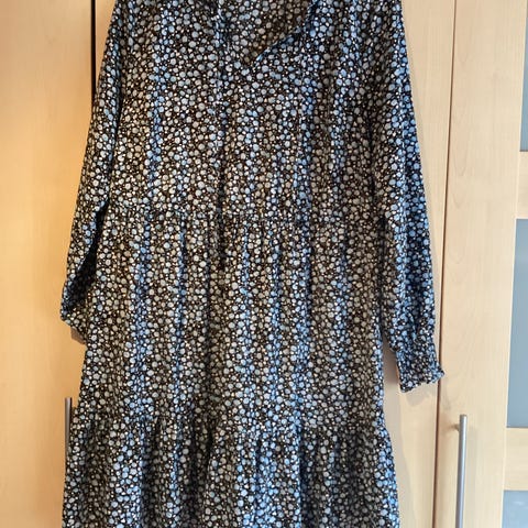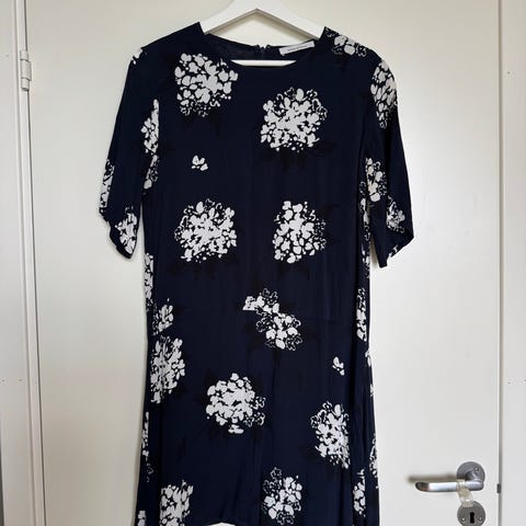 Pent brukt A-formet kjole fra Samsøe Samsøe str S. Mønster i blått og hvitt.