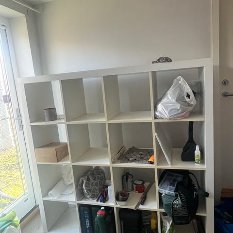 Selger en pent brukt IKEA KALLAX hylle med 8 rom (2x4). Hyllen er svært allsidig og kan brukes både stående på høykant, liggende langs gulvet, eller monteres på veggen slik den er vist på bildene.