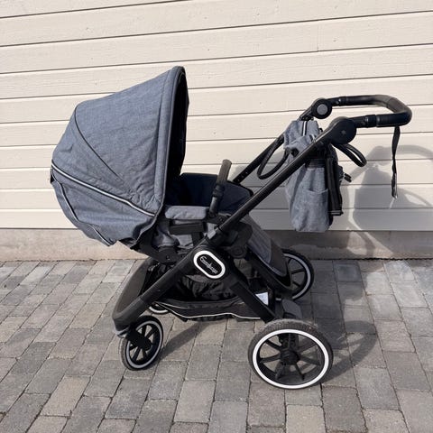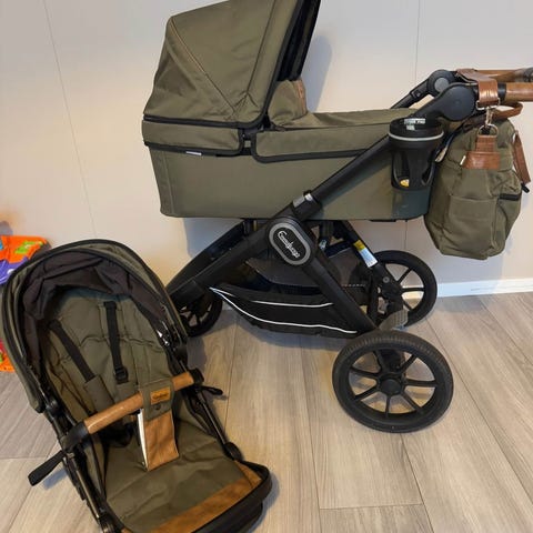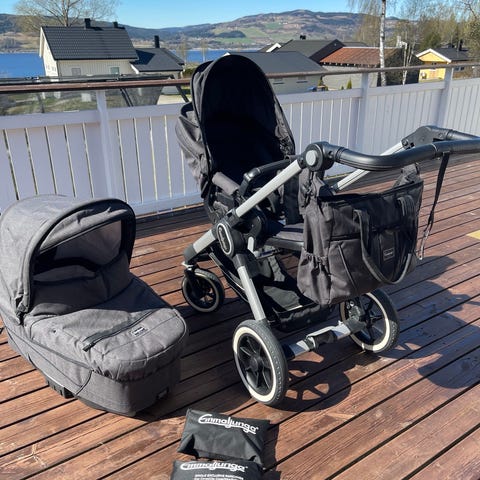 Barnevogn Emmaljunga NXT90F Outdoor selges med bag- og sportsdel. Denne varianten passer perfekt for både nyfødt og utover siden den har større sportsdel som passer litt lengre. Lufthjul som gjør den veldig behagelig å trille på både grus og snø samtidig som det gir litt ekstra demping. Begge deler kan snus frem-eller bakover, kjekt når man vil se barnet på trilletur. 2020 modell. Original myggnetting og regntrekk medfølger. Pent og mest brukt som sovevogn hjemme, alt fungerer som det skal, mindre vanlige bruksmerker kan forekomme. Det er klistret refleks-merker på understellet, kjekt i mørket men kan fjernes. Røyk og dyrefritt hjem, oppbevart innendørs. Brukt skinn i bag-delen, så madrassen er uten flekker, plettfri håndtak. Bildene er tatt i fjor sommer, vogna har siden ikke blitt brukt og har stått lagret tørt innendørs. Må hentes område Fagernes/Leira.