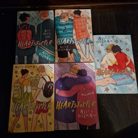 Heartstopper bøkene 1-4, lest en gang. Og to noveller som handler om samme karakterer.