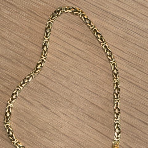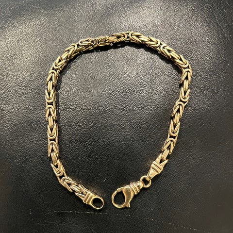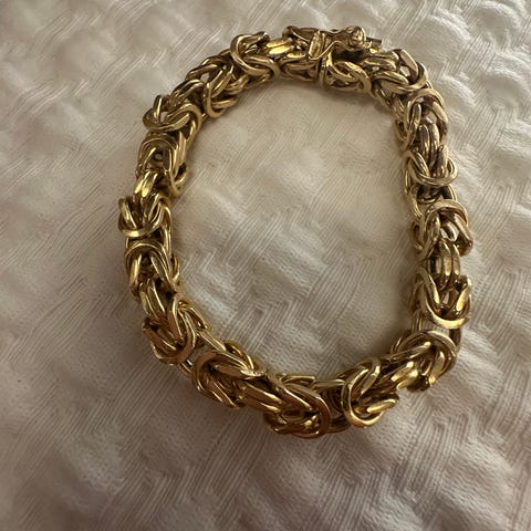 Selger mitt armbånd i det populære design Konge. Armbåndet er som nytt. Brukt fåtall ganger etter det kom fra gullsmed og selger. Det fremstår som nytt. Det er 21 cm, veier 16 gram og har tykkelse på 3 mm. 585 - 14 Karat.