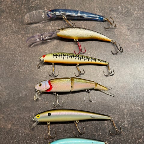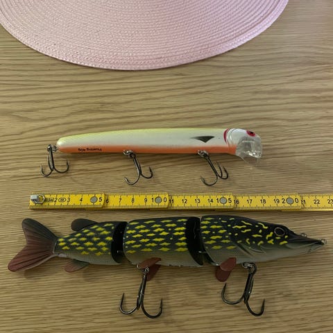 Sett med tre wobblere/fiskesluker i hardplast med treblekroker. Slukene har ulike størrelser og farger: én lang, slank wobbler i grønn/oransje mønster, én middels lang wobbler i lilla/hvit med prikker, og én kortere wobbler i svart/gul. Egnet til sportsfiske etter ulike rovfiskarter i ferskvann eller saltvann, avhengig av vekt og rigging. Leveres som vist på bildene.