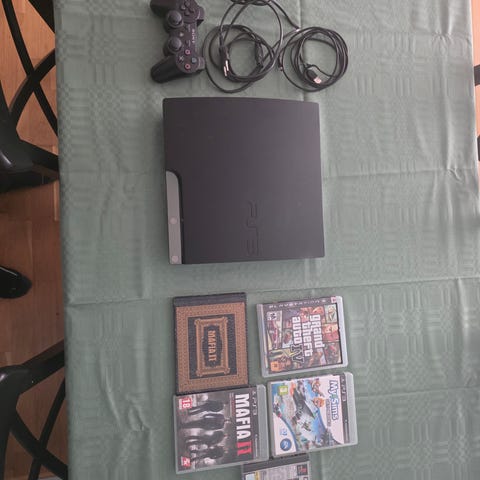 Sony Playstation 3 spillkonsoll med tilbehør.