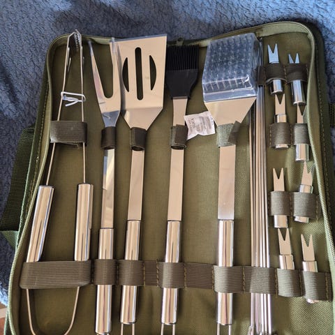 3 delt grillfest i stainless Steel selges. Lengden på delene er ca 46 cm.