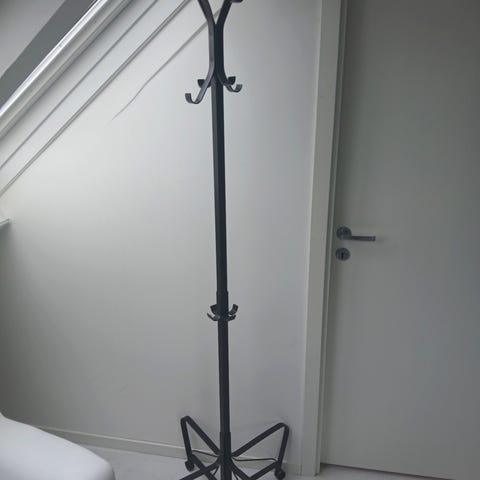 En HEMNES stumtjener fra IKEA. Det er et klassisk klesstativ i sortlakkert stål med åtte kroker øverst til hatter og kåper, samt åtte kroker i midthøyde som er lettere tilgjengelig for for eksempel barn