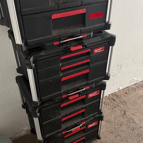 Alt utstyret er fra tidlig 2025. Det er "godt brukt", som betyr at det finnes riper og støv, men Milwaukee Packout er bygget for å tåle krig. Alt fungerer teknisk perfekt – låser sitter som de skal, og hjulene ruller godt.
