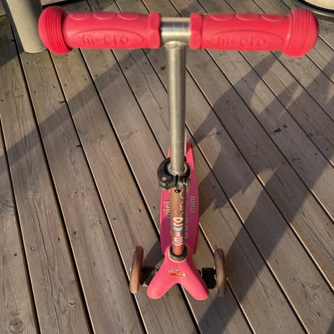 Disney Frozen trehjul sparkesykkel i blå og rosa farger. Sparkesykkelen har tre hjul for ekstra stabilitet, med to hjul foran og ett bak. Dekket er dekorert med Frozen-motiv. Passer til barn som ønsker en enkel og stabil sparkesykkel til lek utendørs på jevnt underlag.
