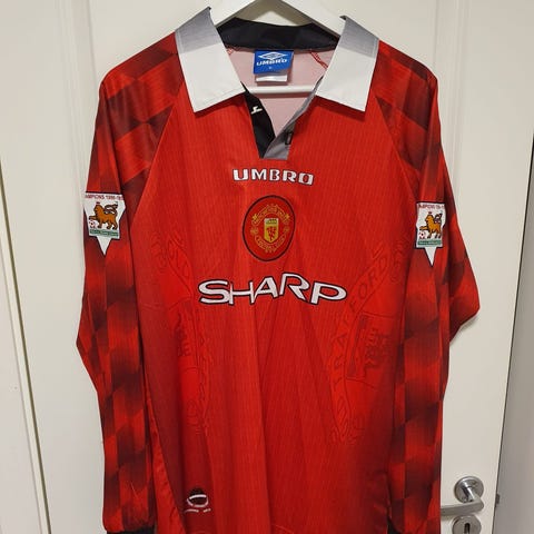 Manchester United retro fotballdrakt i svart med gule og blå detaljer. Offisielt retroprodukt merket med klubbens logo på brystet og «Sharp Viewcam» trykk foran. Kortermet modell med krage og knapp i halsen. Størrelse M. Passer til bruk som supportereffekter eller til fritidsbruk.