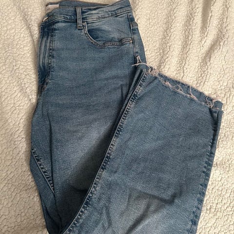 Mango jeans for dame i svart denim. Buksen har størrelse XXL og livvidde W36. Klassisk 5-lommersmodell med beltehemper og glidelås med knapp i front. Rå kant nederst på bena med frynser, som gir en uferdig avslutning. Passer til hverdagsbruk og kan kombineres med ulike topper og sko.