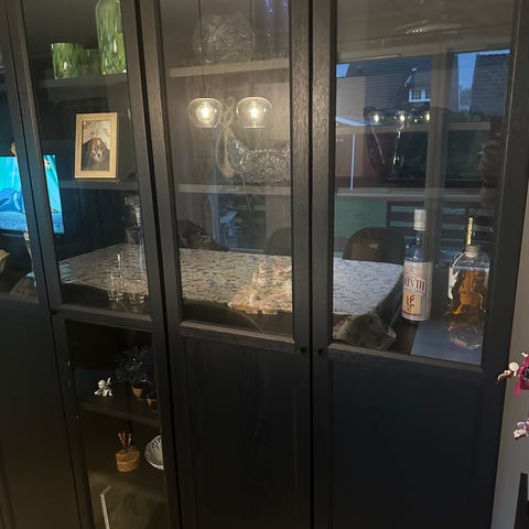 2 stk 80x28x202 Billy bokhyller fra IKEA med installerte OXBERG vitrinedører. De har til sammen en bredde på 160cm. Bokhyllene er i fargen brunsvart.