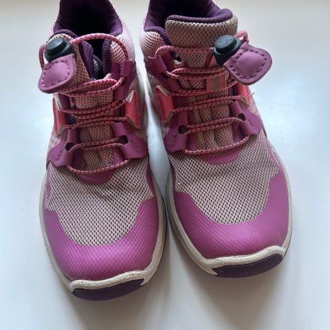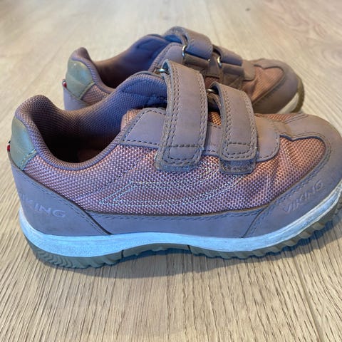 Viking joggesko for jente i størrelse 28. Skoene har overdel i tekstil og syntetisk materiale i ulike lillatoner med detaljer i gult. De har to borrelåsstropper over vristen for enkel justering og av- og påtaking. Yttersålen er i gummi med mønster for grep. Egnet som hverdagssko og til lett aktivitet for barn. Vannavvisende overflate.