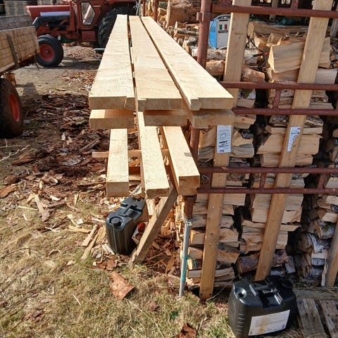 Brukte trebjelker/terrassebord egnet for utendørs bruk. Bordene har vært benyttet som gangbane og har fått grønske etter bruk utendørs. Kan egne seg til gjenbruk i ulike byggeprosjekter, som gangbane, platting eller andre konstruksjoner der utseende ikke er avgjørende. Dimensjoner og mengde avklares med selger.