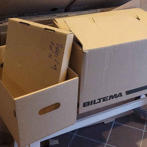 Selger pent brukte flytteesker. Et par glasskillere er inkludert