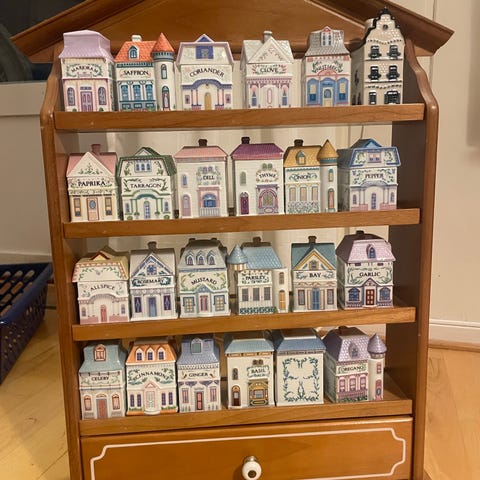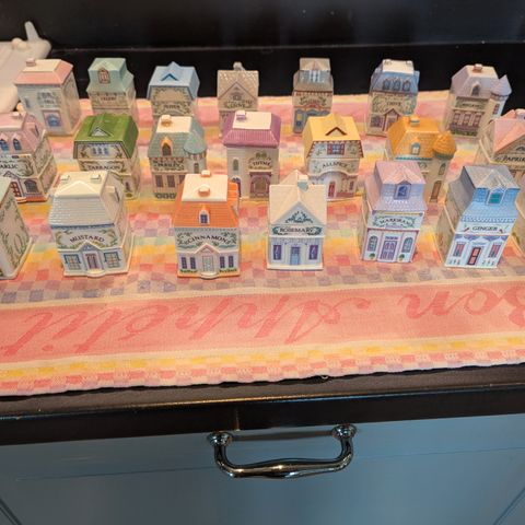 24 hus (alle forskjellige),uten skader og med originalmerking i bunnen. Settet består av flere små keramikkhus med påskrift for ulike krydder på hvert hus. Husene er dekorative og kan brukes til oppbevaring av krydder eller som samleobjekter og pynt på kjøkkenet. Hvert hus har lokk og er utformet i ulike farger og fasonger. Originalhyllen disse skal stå i mangler.