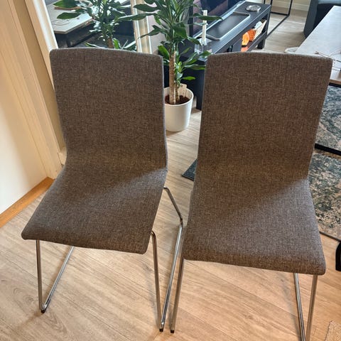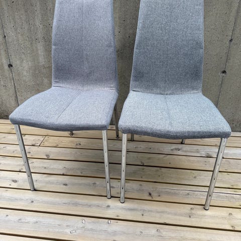 Stolene har et tidløst design med grått stoff og solide metallbein. De er gode å sitte på og passer fint både rundt spisebordet og kan stables som ekstra stoler.