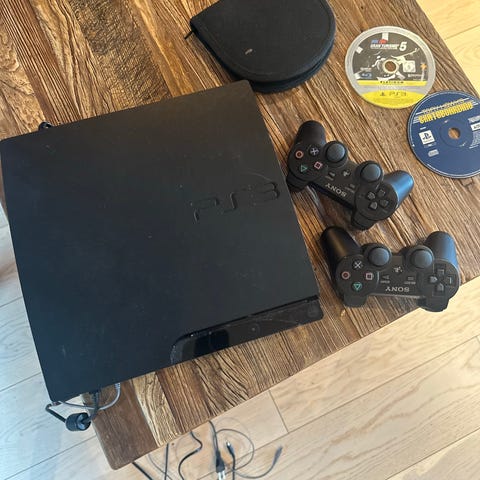 Sony PlayStation 2 spillkonsoll i svart. Konsollen er av den klassiske modellen (fat) og har tilkoblinger for kontroller, minnekort og USB. På bildene følger det med én håndkontroller, en 8 MB minnekort for PlayStation 2 samt noen spillplater. Egner seg til PlayStation 2-spill og DVD-avspilling.