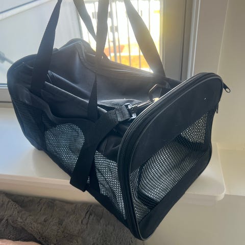 Sammenleggbar hundebur i svart stoff. Buret har nettingpaneler for lufting og innsyn på flere sider, samt åpning foran og på toppen. Innvendig ligger en myk pute/bunn for økt komfort. Egnet til transport og som midlertidig liggeplass for mindre hunder eller andre små kjæledyr. Kan foldes sammen når det ikke er i bruk.