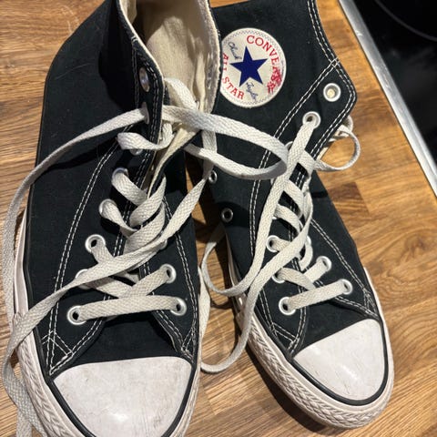 Converse Chuck Taylor All Star høye sneakers i størrelse 40. Modellen er klassiske høye canvas-sko med snøring foran og gummisåle. Skoene er røde med hvite lisser og hvit gummitå. Passer som fritidssko og til hverdagsbruk.
