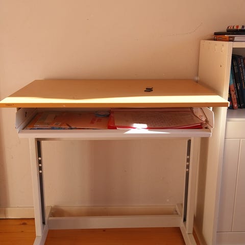 Hvit skrivebord med et foran skuffen og bak et lagringsplass for kabler.