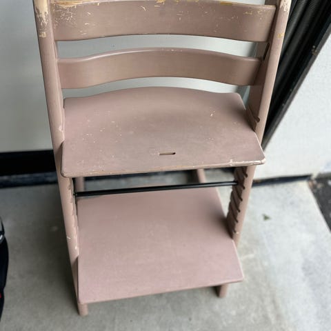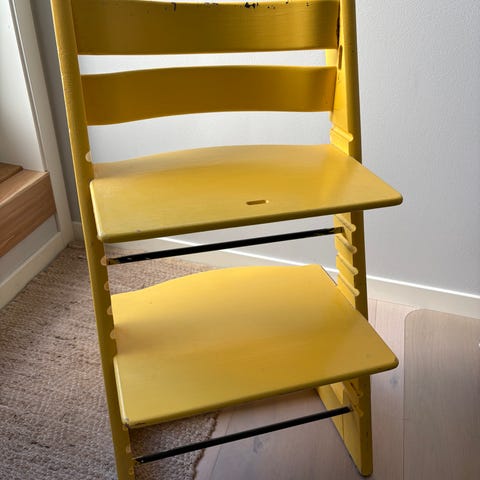 Stokke Tripp Trapp, eldre modell som selges uten bøyle. Gulmalt med en del bruksmerker, men klar for mange års bruk videre.