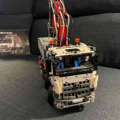 LEGO Technic lastebil med kran. Modellen består av en flerakslet lastebil med førerhus, tippbart lasteplan og påmontert kranarm. Konstruksjonen viser typiske Technic-detaljer som bevegelige deler, støtteben og funksjonelle elementer i chassis og overbygg. Egnet for bygging, lek og som utstillingsmodell for LEGO Technic-interesserte.