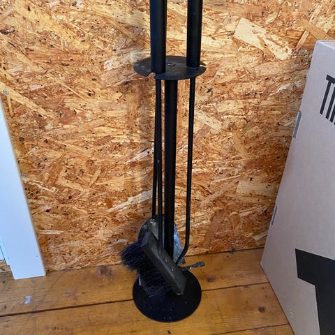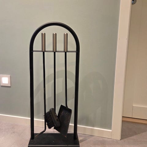 Peissett i svart metall med blanke håndtak Settet består av flere redskaper. Redskapene henger på et stativ som står på gulvet.