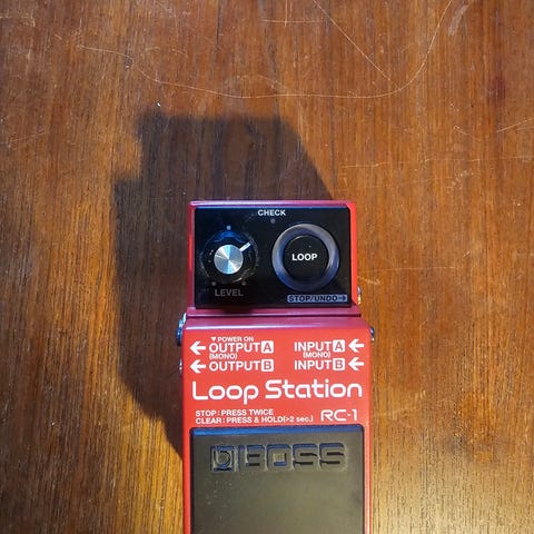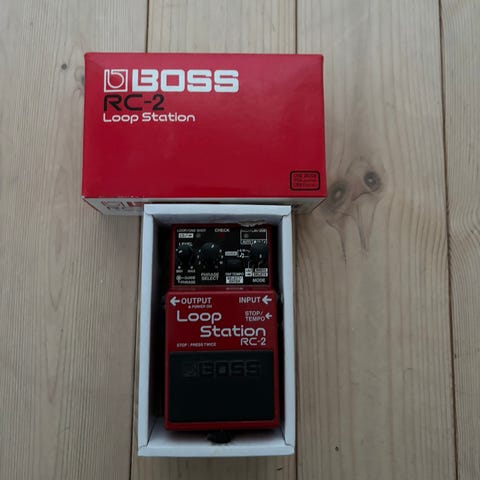 Boss RC-3 Loop Station gitarpedal i rød farge. Kompakt looper-pedal for gitar med innebygget minne for lagring av looper og flere kontrollknapper for styring av opptak, avspilling og overdubbing. Pedalen har separate inn- og utganger, og drives vanligvis med strømforsyning eller batteri.