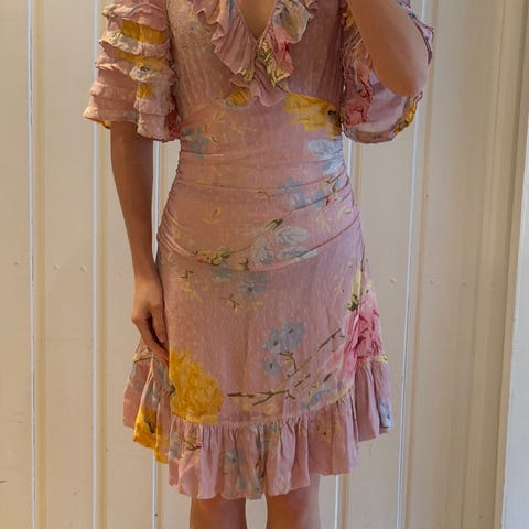 Urban Pioneers sommerkjole i størrelse XS. Kjolen er rosa med blomsterlignende mønster i rosa og grønt. Den er laget i viskose, som gir et lett og mykt stoff. Modellen har korte ermer med lagte volanger og innsvinget midje som gir en feminin fasong. Passer som sommerkjole til hverdagsbruk eller enkle anledninger. Den har en flekk helt nederst som kan vaskes bort. Brukt kun to ganger.