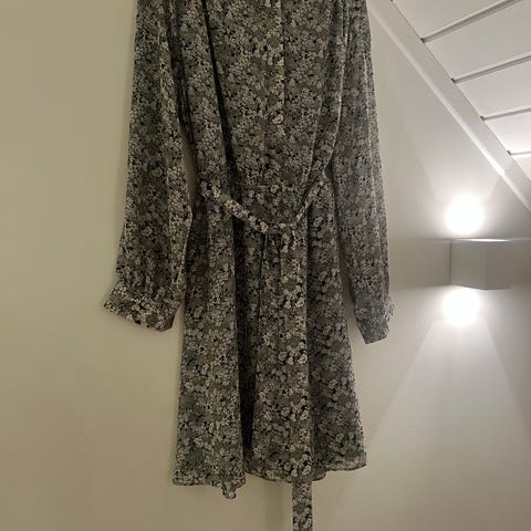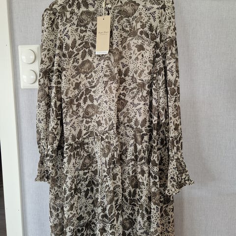 Part Two Falippa hverdagskjole for dame i størrelse 40. Kjolen er laget i viskose og har et flerfarget blomstermønster. Modellen har lange ermer med strikk nederst og v-utringning med knappelukking øverst. Det følger med ensfarget underkjole for bedre dekning. Passer som hverdagskjole og til enkle anledninger.