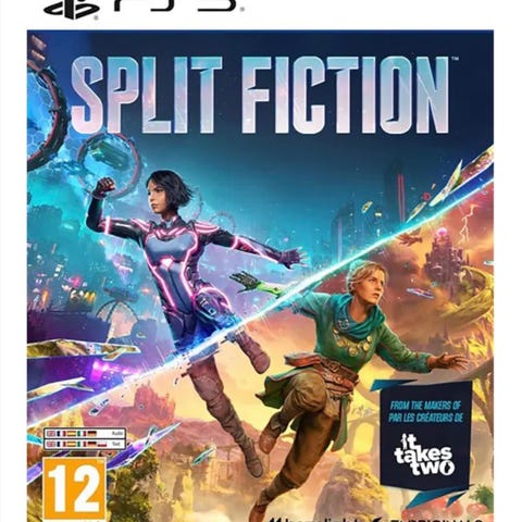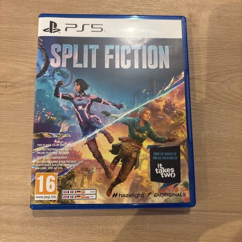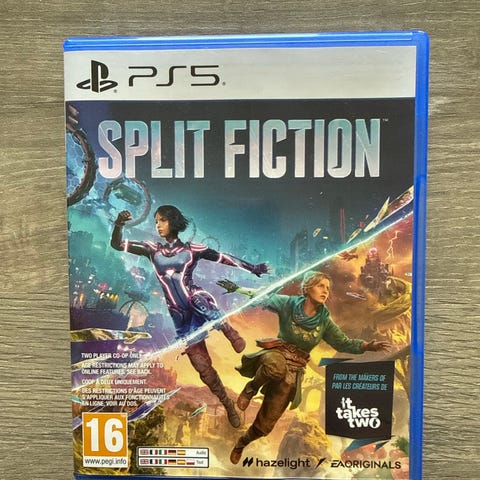 PlayStation 5 Split Fiction spill. Fysisk utgave på disk til PS5-konsoll. Spillet er merket med aldersgrense 16 år (PEGI 16)