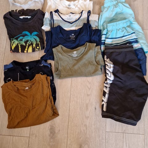 t-skjorter for gutt i størrelse 128. Pakken består av flere t-skjorter i ulike flerfargede design, blant annet med trykk og mønster. Passer for barn rundt 7–8 år.