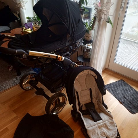 Emmaljunga barnevogn med sportsdel og liggedel svart