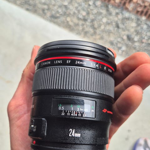 Zoomobjektiv med brennviddeområde 24–105 mm og konstant maksimal blender f/4. Objektivet tilhører Canons L-serie og har innebygd bildestabilisering (Image Stabilizer) for å redusere kamerarystelser. USM-motor gir rask og relativt stillegående autofokus. Frontdiameter for filter er 77 mm. Følger med CPL filter