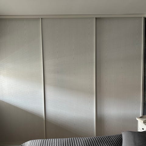 Skyvedører i hvit utførelse. Frontene har en lys trestruktur og glatte profiler langs kantene for enkel åpning og lukking.