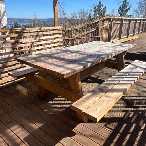 Hjemmesnekret piknikbord i impregnerte materialer Bordet har integrerte benker på begge sider og er egnet til bruk utendørs, for eksempel i hage, på terrasse eller på hytte. Konstruksjonen er laget av impregnerte materialer. Kan behandles med maling/ beis når materialene er ferdig tørket.