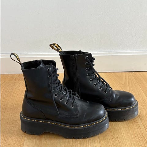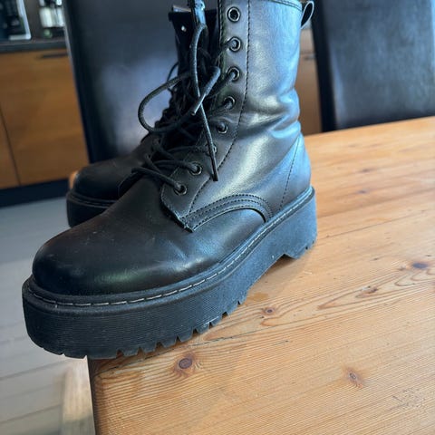 Sorte Doc Martens boots med ekstra tykk såle, glidelås i siden og sort søm rundt sålen. 8 hulls.