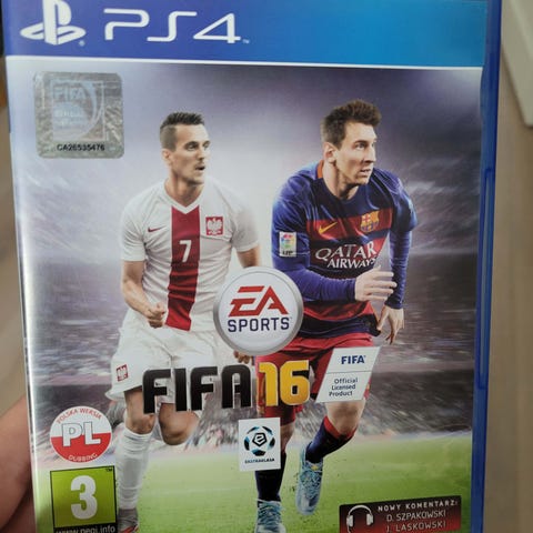 EA Sports FIFA 16 spill til PlayStation 4. Fotballspill på Blu-ray-plate i originalt PS4-cover. Aldersgrense PEGI 3. Støtter flerspillermodus lokalt og online, avhengig av PlayStation Network-tjenester og internett-tilkobling. Inneholder ulike ligalisenser og turneringer slik som vist på omslaget. Egnet for bruk på PlayStation 4-konsoll med kompatibel programvareversjon.