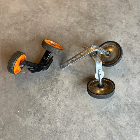 Barnesete til brompton med polstret sete og oransje bøyle. Setet har klemmefeste for montering på setepinne og ramme, og metallkonstruksjon med justerbar høyde/posisjon.