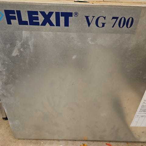 Flexit VG 700 Vann ventilasjonsaggregat med elektronisk styring. Aggregatet drives på 230V / 50Hz og har en strømstyrke på 6,35A og effekt på 1460W. Enheten er tilpasset vannbåren varmeveksling og har tilkobling for kanalventilasjon.