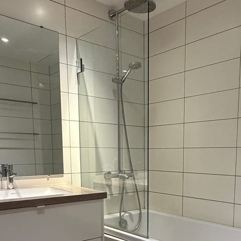Baderomsinnredning hvit med dusj, speil med lys og kont. dusjvegg og servantskap