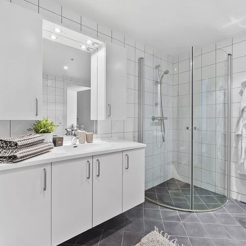 Baderomsinnredning hvit fra Strai. Nytt i 2016. Løsningen inkluderer dusjhjørne med glassvegger og vegghengt dusjarmatur, og hvitt servantskap med doble servantkraner. Over servanten er det speil med integrert belysning. Innredningen selges samlet eller del for del. Blir demonter i midten av april.